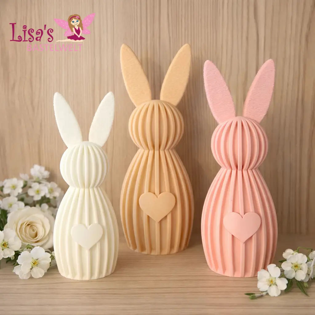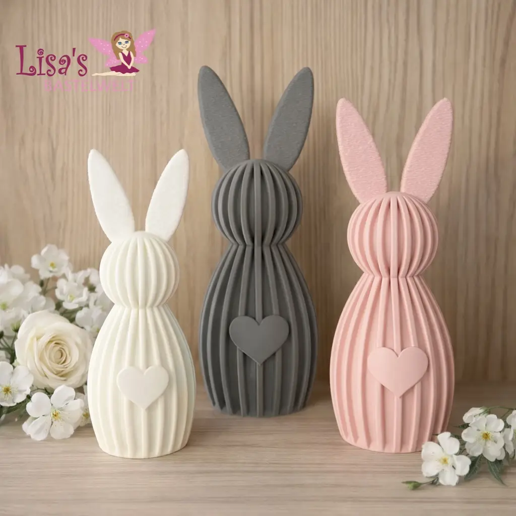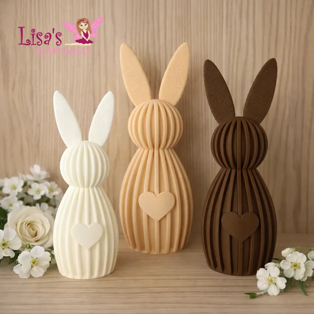 3-teiliges Hasen-Set aus PLA (Polylactid – biologisch abbaubarer Kunststoff aus nachwachsenden Rohstoffen). Ca. 18/15,5/13 cm groß und in 4 verschiedenen Farbvarianten erhältlich.