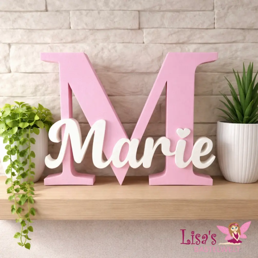 Das Produkt wird aus PLA im 3D-Druckverfahren hergestellt und hat eine Höhe von 15 cm (die Breite variiert je nach Buchstabe zwischen 10 cm und 18 cm).