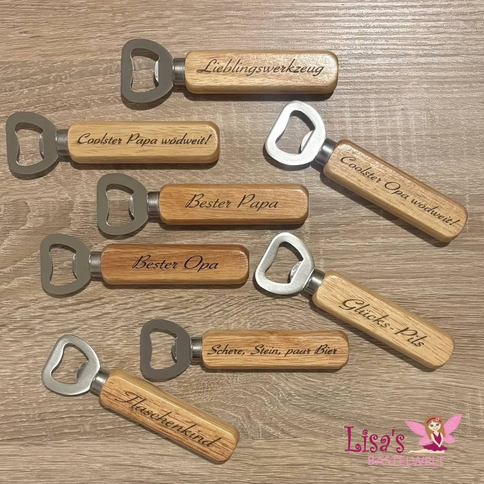 Hochwertiger Flaschenöffner (14 cm) aus robustem Edelstahl mit ergonomischem Massivholzgriff. Dank der Gravur – 8 Auswahlmöglichkeiten – auch perfekt als persönliches Geschenk.