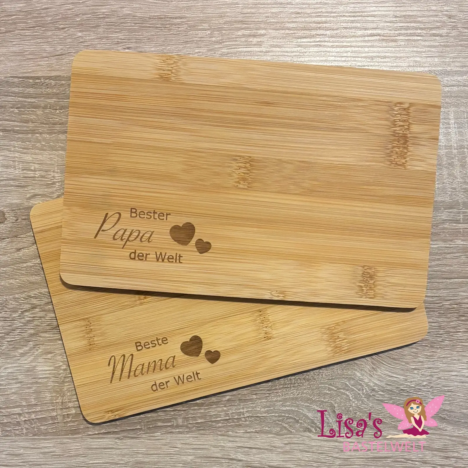 Die Holzbretter haben jeweils eine Größe von 25 × 16 cm und sind im Set mit den Schriftzügen „Mama“ und „Papa“ erhältlich.