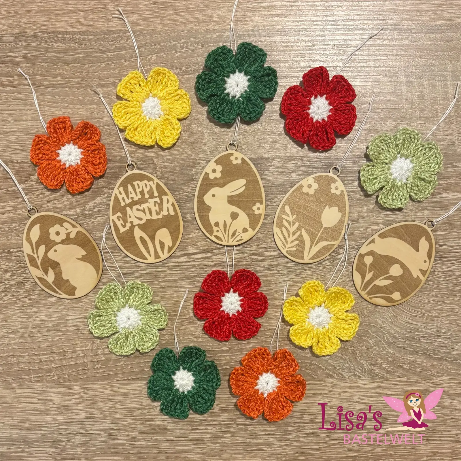 Fünfzehnteiliges Set, bestehend aus je 2 Blumen in den Farben Orange, Gelb Dunkelgrün, Rot und Hellgrün, je ca. 6 cm groß, sowie 5 gelaserten Holzeiern mit süßen Ostermotiven, 7,5 cm groß, mit Schnur zum Aufhängen.